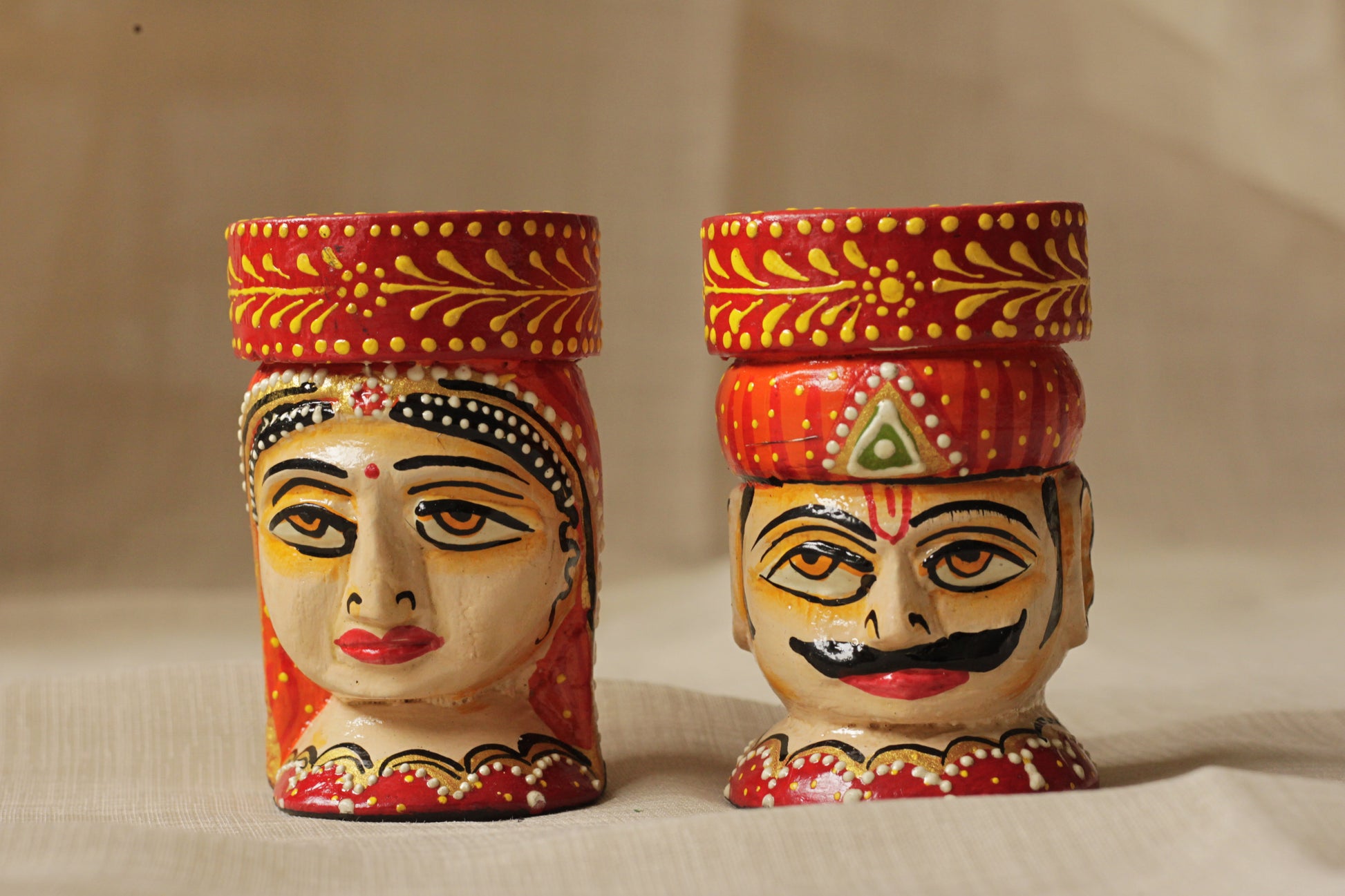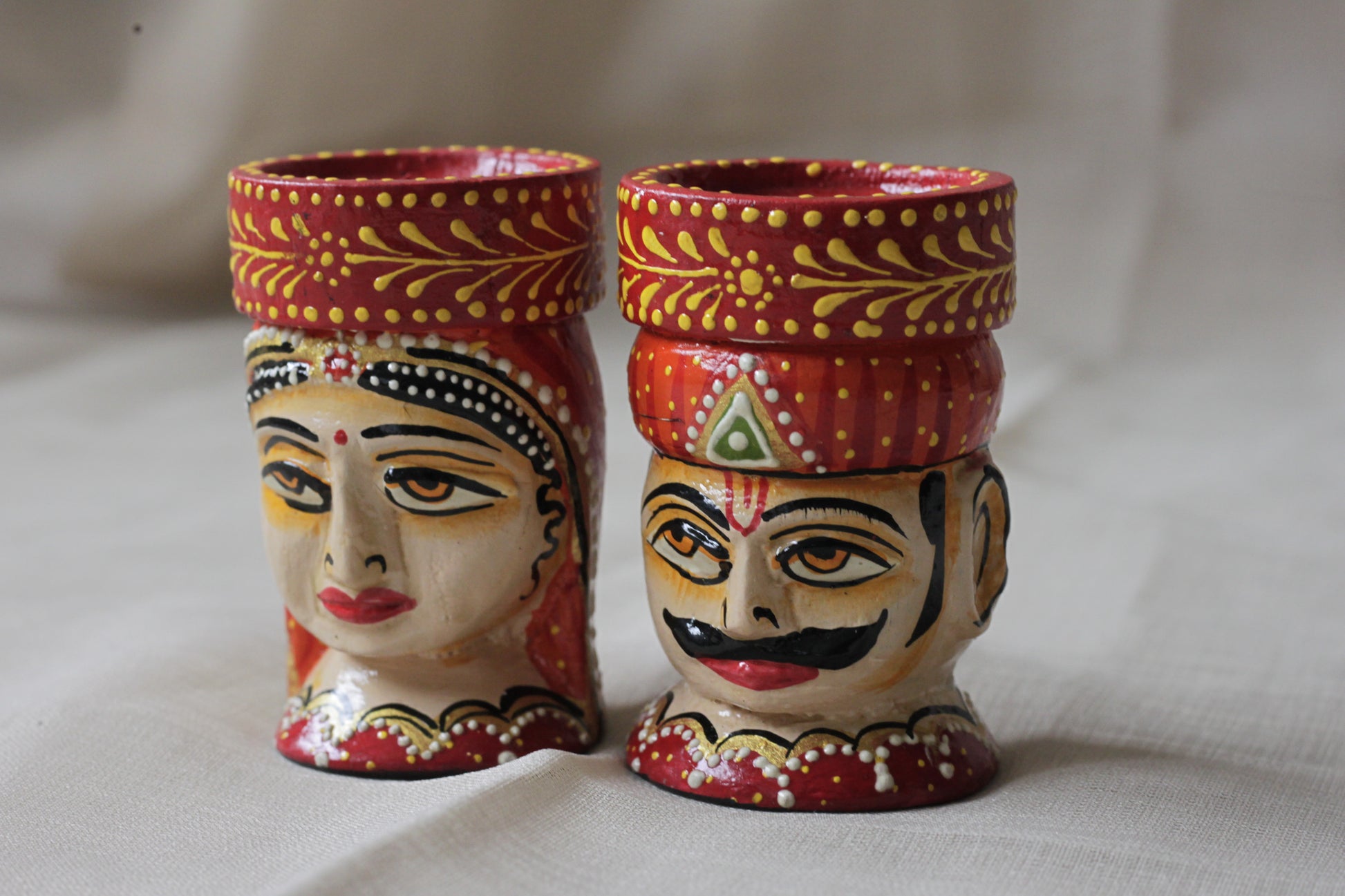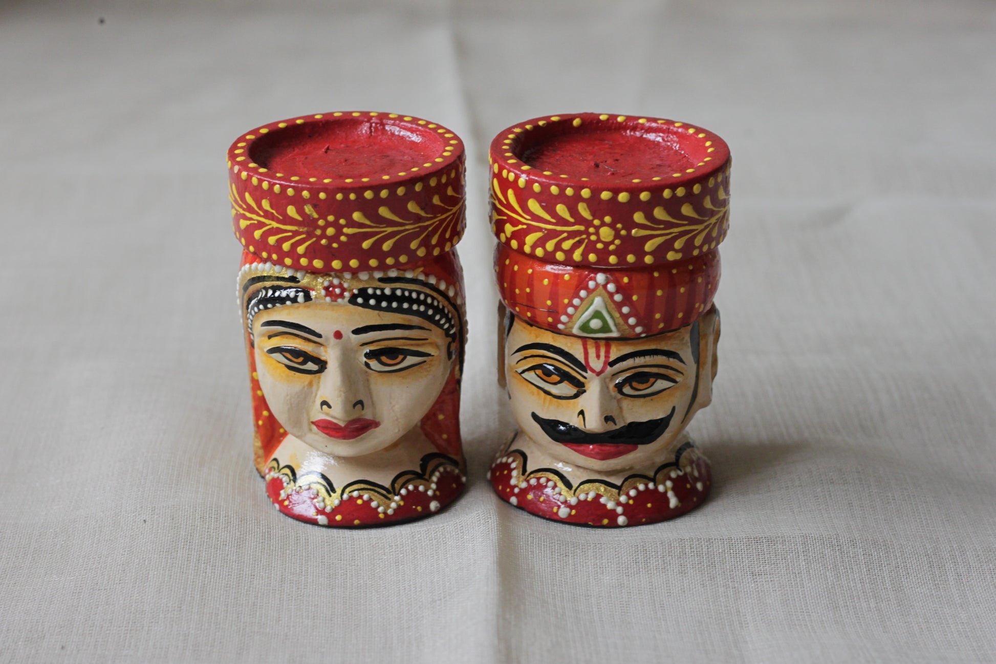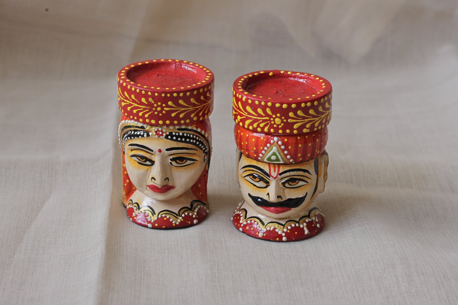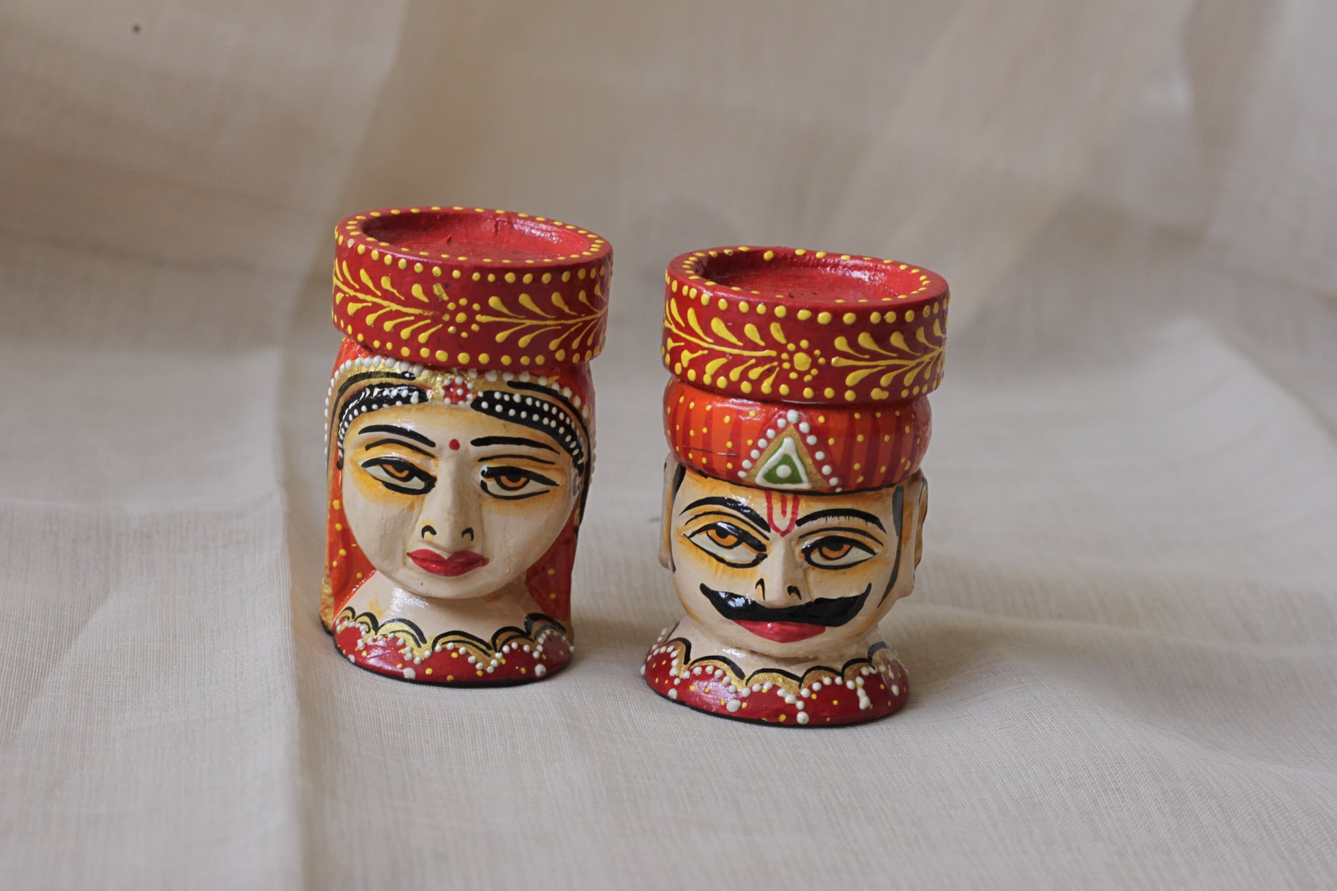 This set of two hand-painted wooden musician candle holders showcases the rich folk art of Rajasthan. Each figurine is carved with care and painted in bright, festive colors, depicting musicians holding instruments while doubling as miniature candle holders. Perfect for festivals, home altars, or as a unique décor accent, these pieces embody cultural charm and handmade beauty.